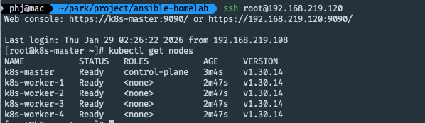 지난 시간까지 Terraform(BPG Provider) 을 이용해 단 1분 만에 5대의 Rocky Linux 서버(Master 1대, Worker 4대)를 찍어내는 데 성공했습니다. SSH 키까지 자동으로 심겨 있어 비밀번호 없이 접속되는 쾌적한 환경입니다.