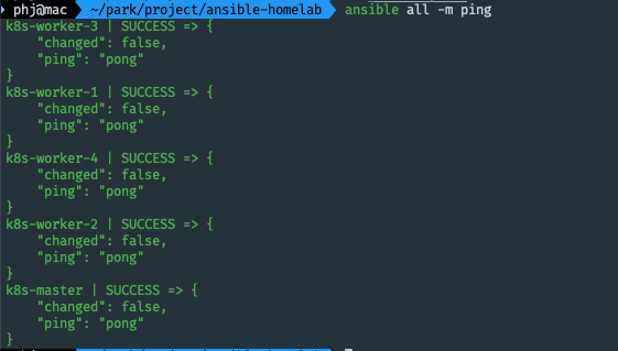 앤서블의 ping 모듈을 사용해 5대 서버가 내 명령을 받을 준비가 되었는지 확인합니다.