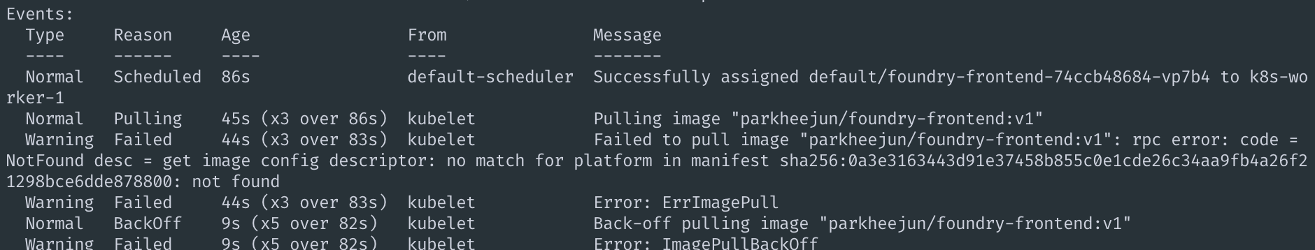 이벤트 로그를 보면 'no match for platform in manifest' 플랫폼이 맞지 않습니다. 왜냐하면 맥북에서 도커 이미지를 만들어서 arm64 로 기본으로 만들어지지만, 미니pc 는 amd64 를 사용합니다. '--platform linux/amd64' 이 옵션을 추가해서 새로 도커 이미지를 만들었습니다.
